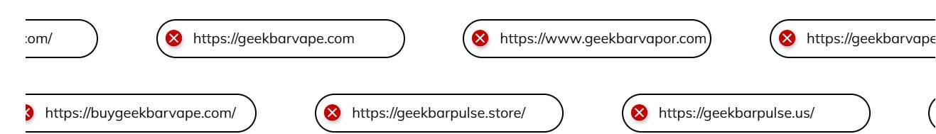 Geek Bar has identified several unauthorized and suspicious websites that claim to sell Geek Bar products. If you’re dealing with any of the following domains, exercise extreme caution: